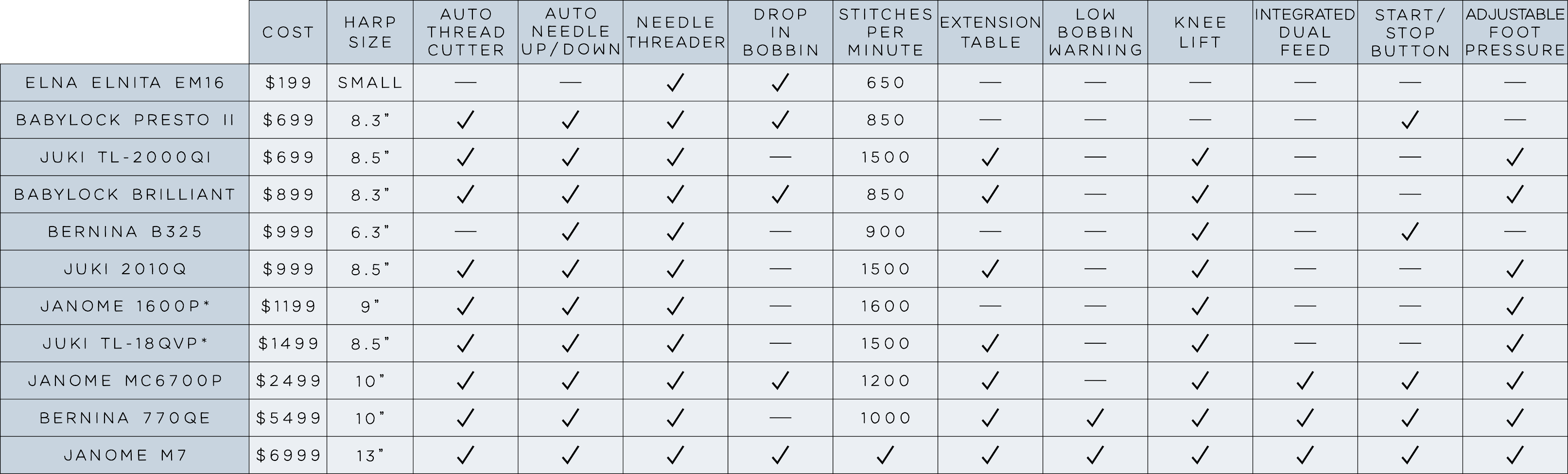 Compiling all of this information was a little tricky because I had to rely on so many different sources - this is particularly true of prices. Each sewing machine has an MSRP, but most dealers will sell the the machine to you at a significant discount or be willing to throw in accessories, discounted or free future machine service, etc.